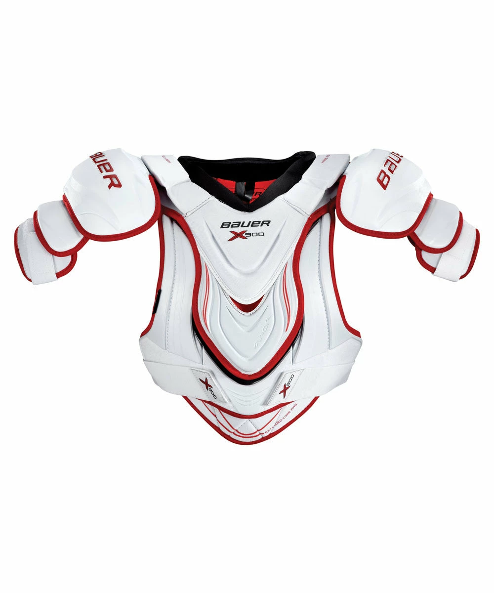 The bottom sternum protection includes Aerolite technology and the top has high density foams for a lightweight protective shoulder pad. The 4-way free flex chest, bicep guard and arch support offer a tapered fit with mobility. Any player who used the Bauer Vapor APX2 shoulder pads will love the look and feel of the new Bauer Vapor X900 shoulder pads.