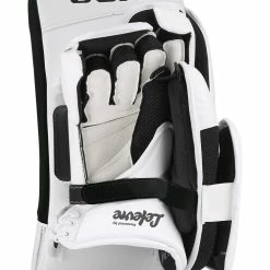 The reinforced palm guard on the hand offers durability and the ventilated mesh palm gusset increases breathability. The molded thumb lock protector adds protection and the finger protectors have an HD foam wrap with added D3O® protection for optimized protection. The blocking board is heat laminated dual density foam with PE board to maximize rebound control. The cuff is an adjustable fit for better stick handling.