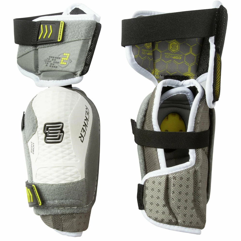 The REKKER Element 2 Elbow Pad offers players both mobility with one piece anatomical elbow cap with molded EVA foam cover construction as well as 3 strap elastic closure system for a secure fit. Stay protected at all times on the ice with Sherwood REKKER Aerofoam and perforated foam bicep for enhanced protection