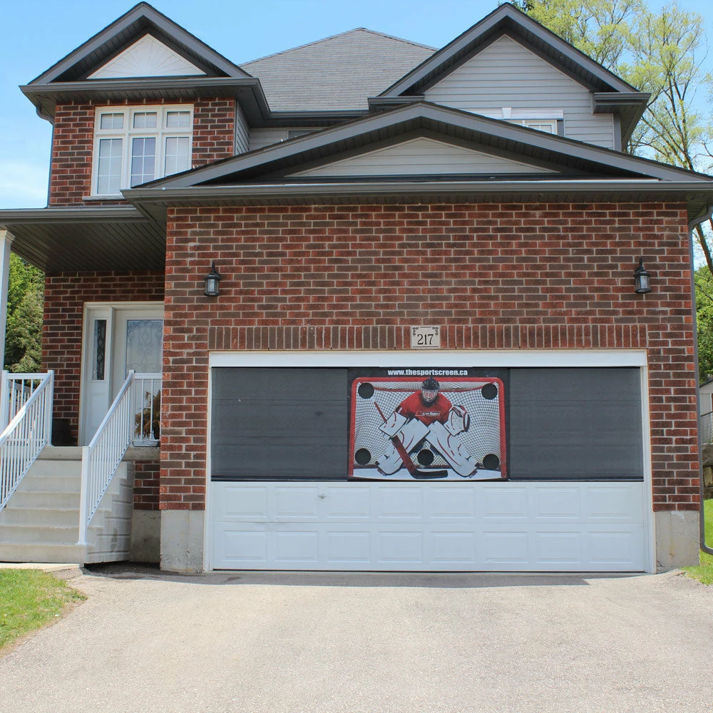 Protect your garage door and turn your driveaway into the perfect hockey playground with The SportScreen. Constructed of Durable, tear proof and weather proof mesh, The SportScreen eliminates the sound of pucks and balls banging on the garage door, while protecting the contents of your garage and vehicles. Set up is a breeze, and operation is simple. A hand crank makes it simple to roll up and down for quick and convenient use for all ages.